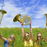Es lebe hoch: die grüne Trompete, das rosa Flügelhorn, das gelbe Horn, die blaue Posaune und die rote Tuba!